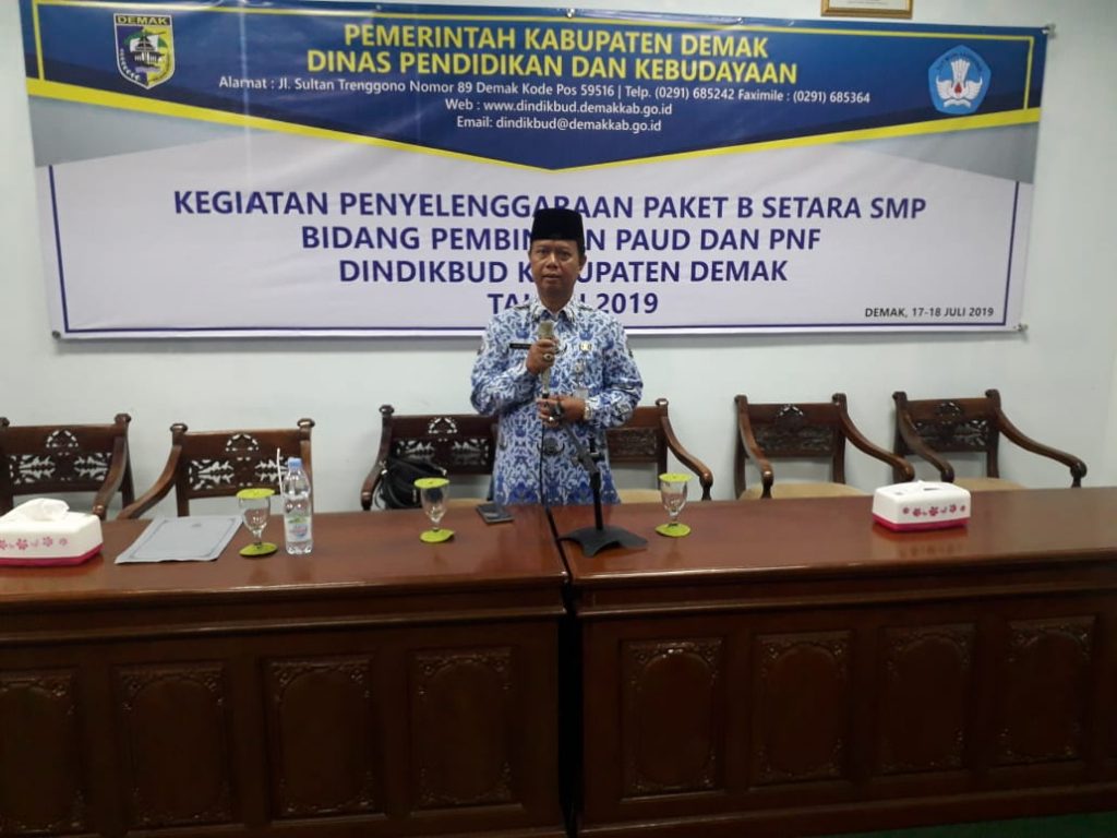 DINDIKBUD-17/07/2019 Kepala Dinas Pendidikan dan Kebudayaan Kabupaten Demak Drs. Anjar Gunadi, M.Pd, membuka kegiatan tersebut menyampaikan bahwa dalam rangka meningkatkan kualitas dan daya saing sumber daya manusia Indonesia perlu dilakukan perbaikan pendidikan kesetaraan. Pendidikan kesetaraan tidak lagi dipandang sebagai pendidikan alternatif, tetapi menjadi pilihan bagi warga belajar.