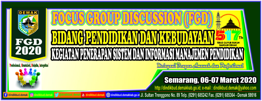 DINDIKBUD-09/03/2020 FGD (Focus Group Discussion) Bidang Pendidikan dan Kebudayaan Kabupaten Demak Tahun 2021, yang dihadiri oleh seluruh Jajaran Pengambil Kebijakan Dinas Pendidikan, dan Organisasi Mitra yang di Buka secara langsung oleh BUPATI Demak, beserta Wakil Bupati, Sekda, dan Asisten Kesra, dengan Narasumber dari BAPPEDA Litbang Demak dan BPKPAD Kab. Demak dengan Kegiatan diharapkan meningkatkan Kualitas Perencanaan dan Penganggaran di Bidang Pendidikan dan Kebudayaan.