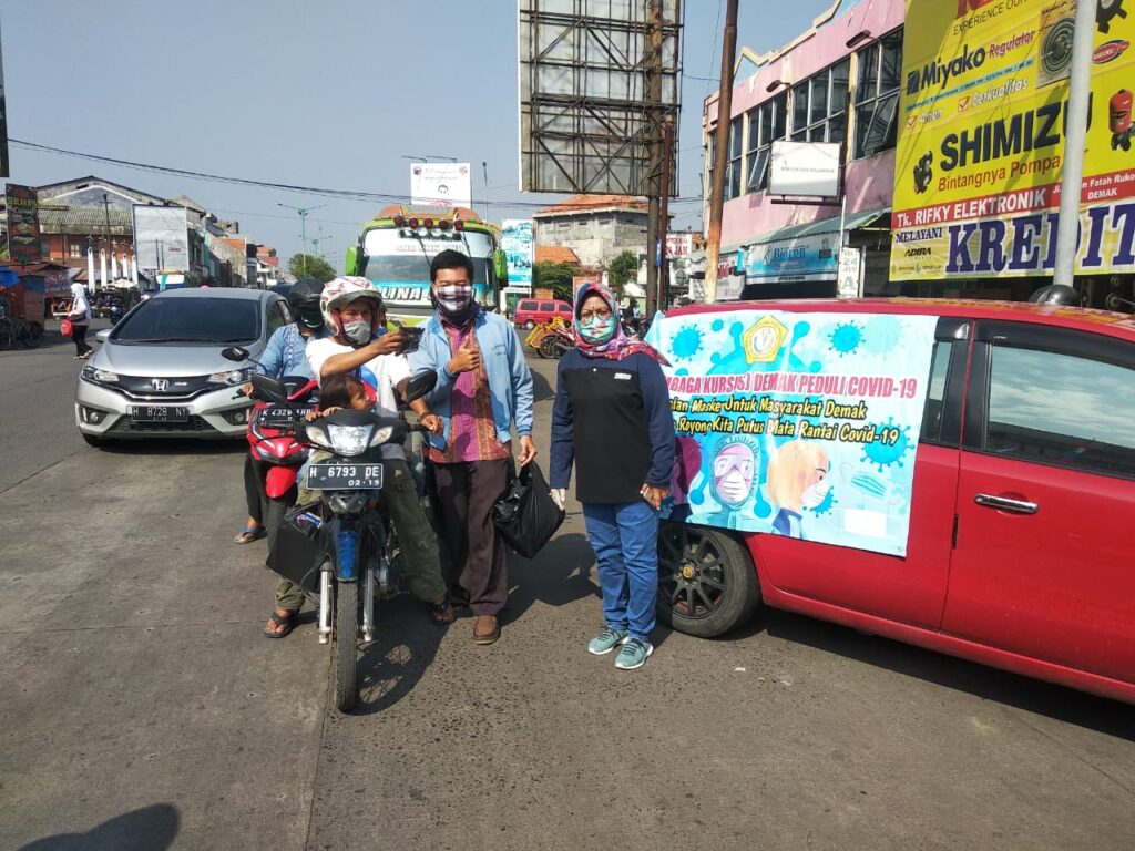 DINDIKBUD-17/04/2020 Pembagian Masker Gratis oleh Dinas Pendidikan dan Kebudayaan Kab. Demak Kepada pengendara yang melewati Jalan di Depan DinDikbud Kab. Demak sejumlah 2.700 masker dari Dinas Pendidikan dan Kebudayaan Kabupaten Demak dan Organisasi Mitra yaitu Forum PKBM, HIPKI dan IPI, dibagikan di depan dindikbud, terminal di depan UPTD dindikbud Demak, Depan Pasar Bintoro, Pertigaan sampangan.