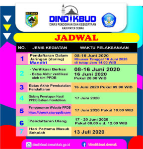 DINDIKBUD-15/06/2020 Pendaftaran Penerimaan peserta didik baru ( PPDB) untuk siswa SMP Negeri di Kabupaten Demak telah dibuka mulai tanggal 08 Juni 2020 secara Daring di Tahun Pelajaran 2020/2021. Memasuki hari ke 5 pendaftaran melalui daring sebagian besar SMP Negeri sudah memenuhi Jumlah peserta didik sudah mencapai 71 % lebih. Adapun kuota untuk PPDB tahun ini secara keseluruhan sebanyak 8.038 siswa, sesuai dengan Juknis PPDB Kabupaten Demak.