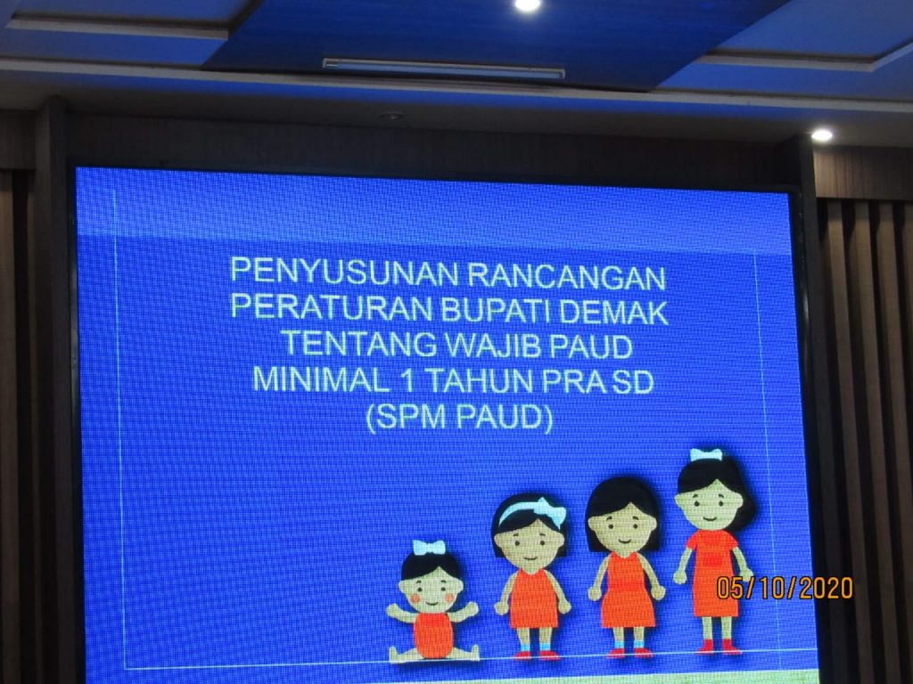 DINDIKBUD-06/10/2020 Dinas Pendidikan dan Kebudayaan Kab. Demak melalui Bidang Pembinaan PAUD dan PNF melakasanakan Kegiatan Rapat Koordinasi dengan OPD terkait tentang Peraturan Bupati Wajib PAUD Minimal 1 Tahun Pra SD kegiatan ini sebagai Implementasi Standar Pelayanan Minimal Pendidikan Anak Usia Dini (SPM PAUD) Kabupaten Demak Tahun 2020, Kegiatan ini di Laksanakan di Gedung Bina Praja Kabupaten Demak pada hari Senin s.d. Rabu, 5 s.d 7 Oktober 2020 mulai pukul 08.00 WIB s.d. 12.30 WIB, dalam Kegiatan tersebut dibuka secara langsung oleh BUPATI Demak HM Natsir menyampaikan beberapa hal terkait Pendidikan Anak Usia Dini :