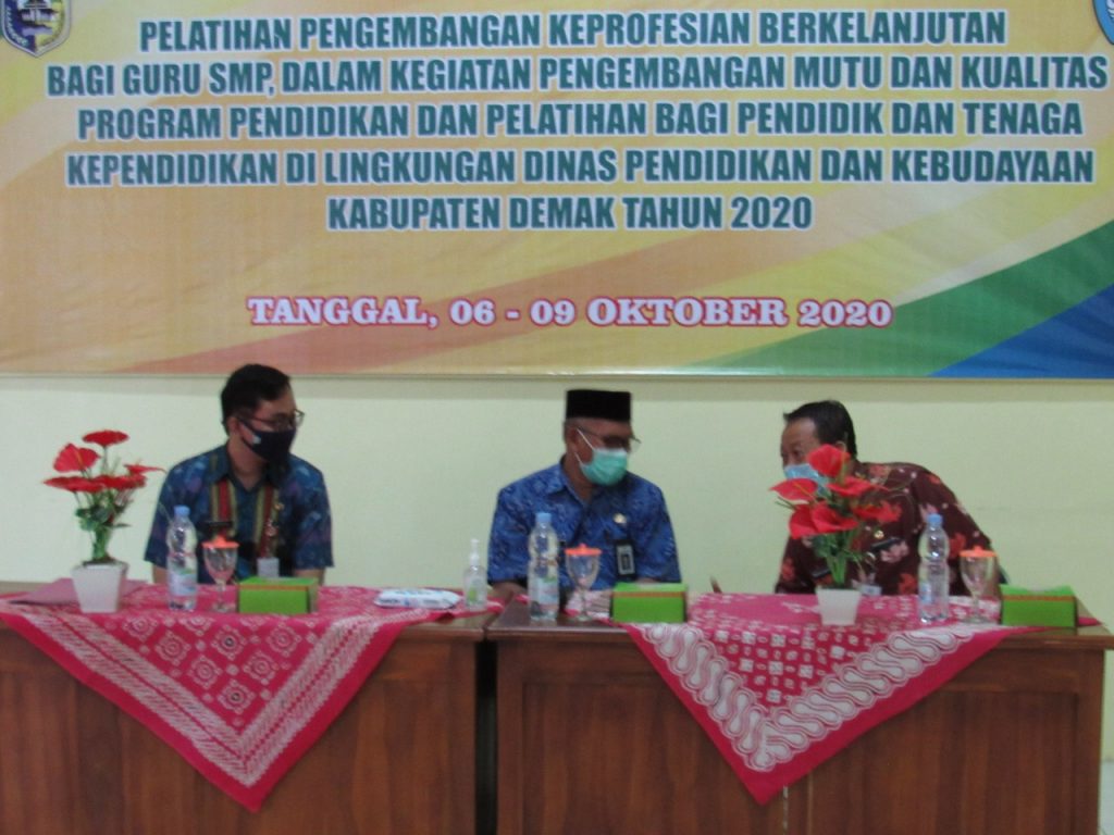 DINDIKBUD-12/10/2020 Dinas Pendidikan dan Kebudayaan Kabupaten Demak Bidang Pembinaan GTK, menyelenggarakan Pelatihan Pengembangan Keprofesian Berkelanjutan (PKB) bagi Guru SMP, yang dilaksanakan pada hari Selasa, 06 Oktober 2020 bertempat di Gedung PGRI Kabupaten Demak, yang mulai Jam 08.30 WIB, Kegiatan tersebut dibuka secara langsung oleh Bapak BUPATI Demak, H.M. NATSIR di dampingi Plt. Kepala Dinas Pendidikan dan Kebudayaan Drs. Eko Pringgo Laksito, M.Si, Beliau Bapak BUPATI menyampaikan Kebijakan Pemerintah Kabupaten Demak Bidang Pendidikan dan Kebudayaan, khususnya menyangkut Guru dan Tenaga Kependidikan.