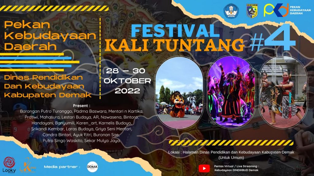 DINDIKBUD-28/10/2022 Dinas Pendidikan dan Kebudayaan Kabupaten Demak melalui Bidang Pembinaan Kebudayaan menyelenggarakan Festival Kalituntang 4 yang dilaksanakan mulai tanggal 28 s.d. 30 Oktober 2022 di Halaman Dinas Pendidikan dan Kebudayaan Kabupaten Demak yang dapat di saksikan secara langsung maupun secara daring dapat di lihat sebagai berikut :