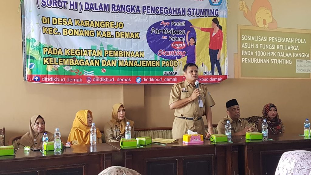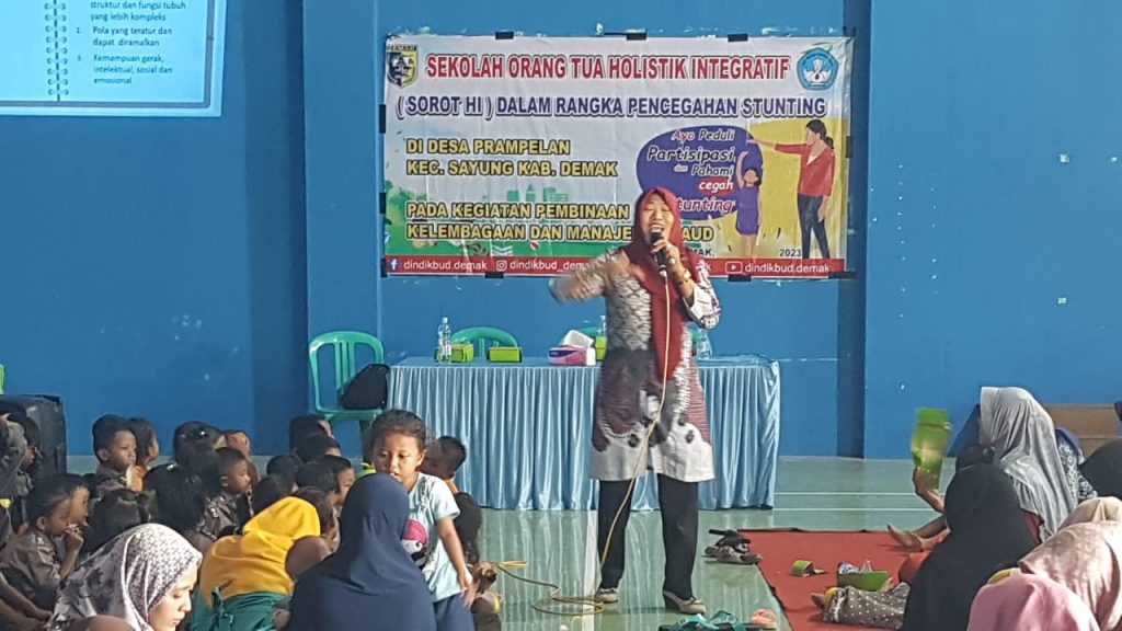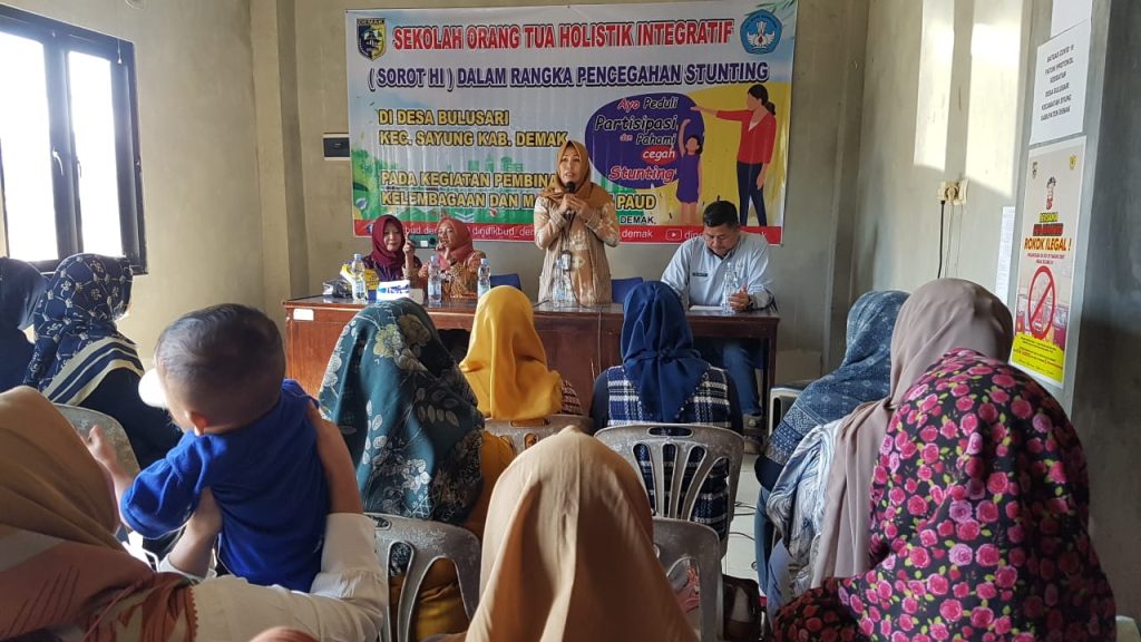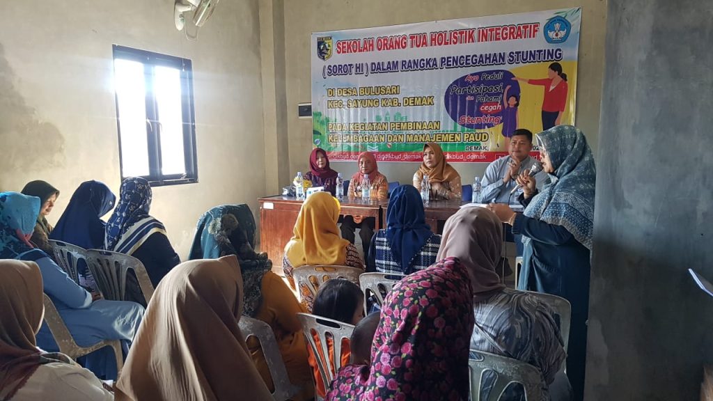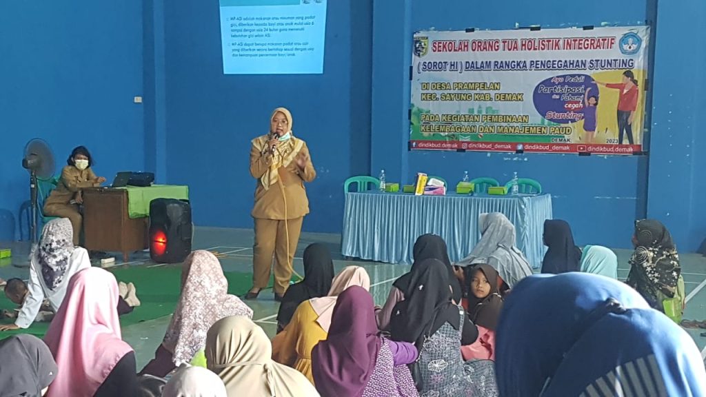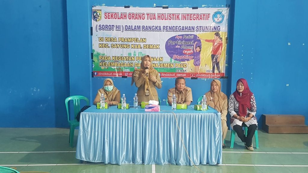 DINDIKBUD-05/06/2023 Dinas Pendidikan dan Kebudayaan Kabupaten Demak melalui Bidang Pembinaan PAUD dan PNF menyelenggarakan Sekolah orang tua holistik integratif Sorot HI dalam rangka pencegahan stunting, acara di selenggarakan selama 8 hari di 8 desa lokus stunting di antaranya Desa Kedungkarang Wedung, Desa Tedunan Wedung, Desa Karangrejo Bonang, Desa Tlogoboyo Bonang, Desa Bunderan Wonosalam, Desa Sidoharjo Guntur, Desa Prampelan Sayung dan Desa Bulusari Sayung dengan mengambil tema ayo peduli, partisipasi, pahami dan cegah stanting. acara di buka oleh Kepala Dinas Pendidikan dan Kebudayaan Kabupaten Demak Haris Wahyudi Ridwan, AP.M.Si di dampingi oleh Kabid bidang pembinaan paud dan pnf Dra. Afida Aspar, M.M. dan Kasi Pembinaan Paud Sumini, SE. MM dan beberapa narasumber dari bidan desa, guru paud hadir pada kesempatan itu Ibu Wakil Bupati Demak Hj. Khodijah Ali Makhsun yang turut memberikan motivasi dukungan pada ibu-ibu muda yang masih mempunyai anak balita.(24/05/2023).
