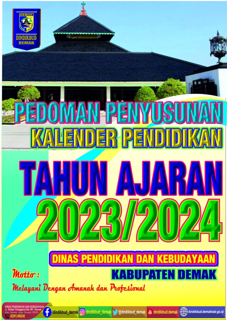 Dalam rangka kelancaran proses pelaksanaan pembelajaran/ pendidikan di Kabupaten Demak selama Tahun Ajaran 2023/2024, berikut kami sampaikan PEDOMAN PENYUSUNAN KALENDER PENDIDIKAN TAHUN AJARAN 2023/ 2024 untuk dijadikan sebagai pedoman Satuan Pendidikan baik negeri maupun swasta di Kab. Demak dalam mengatur waktu pembelajaran selama Tahun Ajaran 2023/2024 sebagaimana terlampir